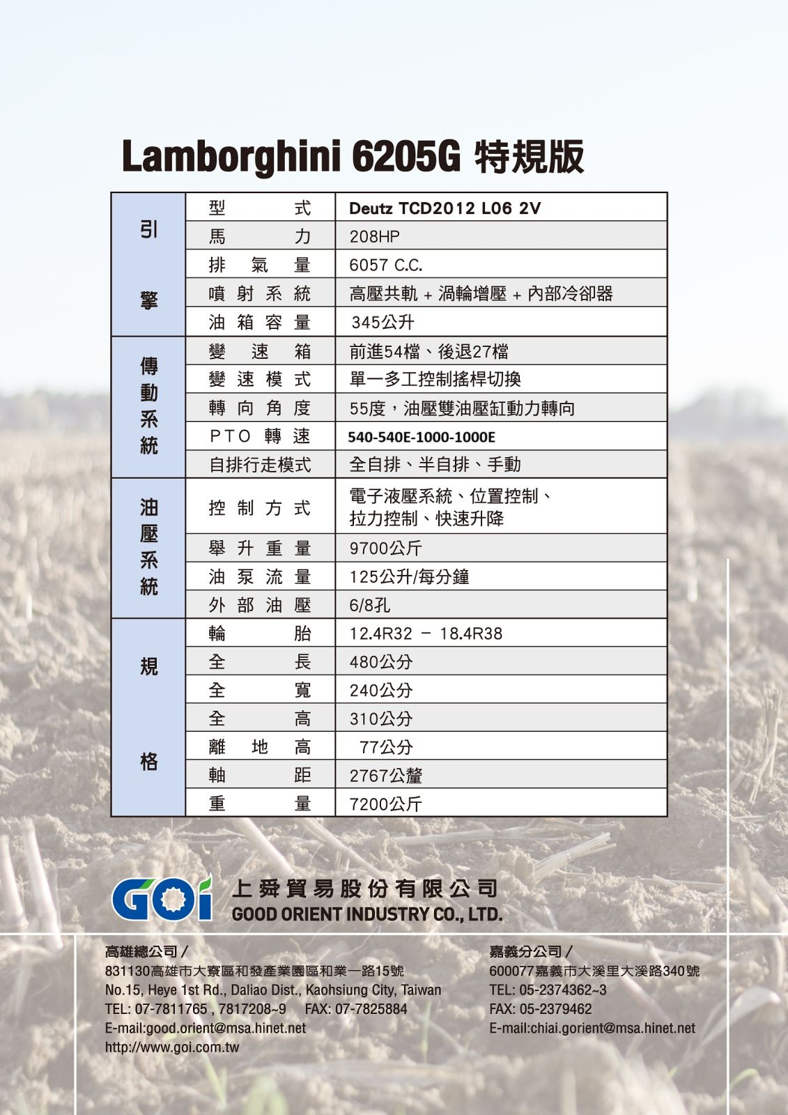 由上舜貿易特別引進之大馬力曳引機,藍寶堅尼特規版6205G,提供給各位全新不一樣的駕駛體驗,頂級的駕駛座艙,獨立的冷氣系統,流線型外觀,充滿霸氣又不失貴氣